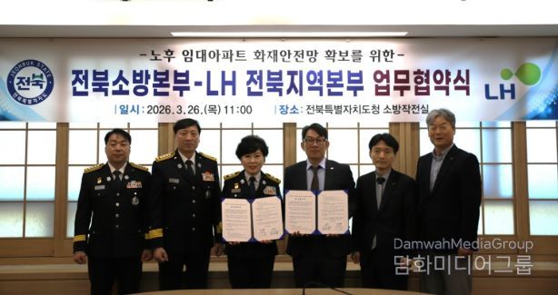 시민행정신문 강갑수 기자 | 전북특별자치도소방본부(본부장 이오숙)는 26일 도청 17층 소방작전실에서 LH 전북지역본부와 노후 임대아파트 화재안전망 확보를 위한 업무협약을 체결했다고 밝혔다.