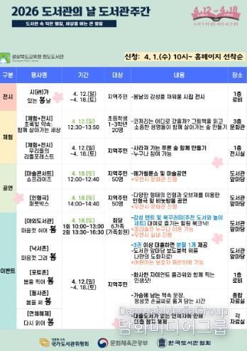 시민행정신문 기자 | 경상북도교육청 청도도서관은 2026년 도서관의 날(4. 12.)과 도서관주간(4. 12.~18.)을 맞아 ‘도서관 속 작은 펼침, 세상을 여는 큰 열림’이라는 주제로 다채로운 문화 행사를 운영한다.