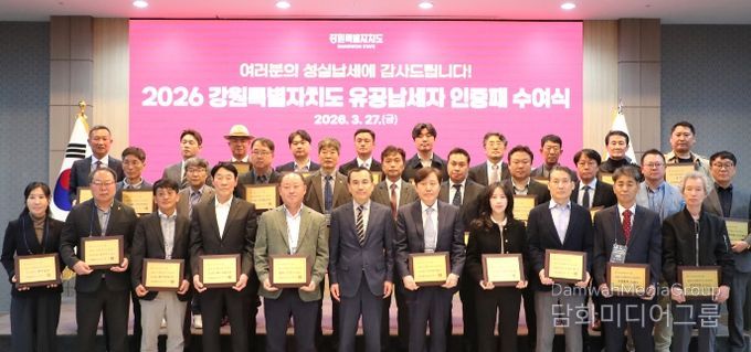 시민행정신문 기자 | 강원특별자치도는 3월 27일, 춘천 스카이컨벤션웨딩홀에서 '2026년 지방세 유공납세자 인증패 수여식'을 개최하고, 어려운 경제 여건 속에서도 납세의무를 성실히 이행해 지역발전에 기여한 유공납세자에게 감사의 뜻을 전했다.
