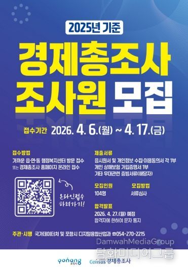 시민행정신문 강갑수 기자 | 포항시는 오는 6월 실시되는 ‘2025년 기준 경제총조사’를 앞두고 조사요원 132명을 모집한다.