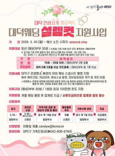 대덕구 관계자는 “최근 결혼 비용 상승으로 청년층의 부담이 커지는 상황에서 이번 사업이 청년 (예비)부부에게 도움이 되길 기대한다”며 “앞으로도 결혼 친화적 환경 조성과 지역 정착 지원을 위한 정책을 지속적으로 확대해 나가겠다”고 말했다.