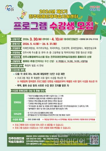 시민행정신문 강갑수 기자 | 진주미래인재학습지원센터는 3월 30일부터 4월 10일까지 ‘2026년 제2기 프로그램’ 수강생을 진주시 통합예약시스템과 미래인재센터 누리집을 통해 모집한다.