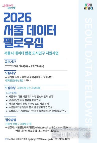 시는 3월 30일부터 4월 19일까지 ‘2026 서울 데이터 펠로우십’ 참여자를 모집하고, 대학원생 등 청년 분석 인재를 중심으로 도시문제 해결 프로젝트를 추진한다고 밝혔다.