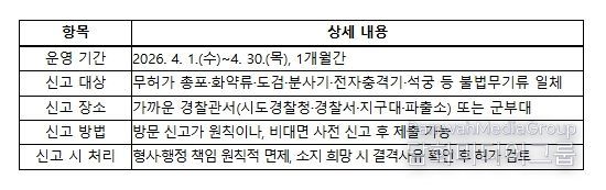 시민행정신문 이존영 기자 | 경찰청은 불법무기류로 인한 범죄와 사고를 미리 방지하기 위하여 국방부 및 행정안전부와 합동으로 4월 1일부터 30일까지 한 달간 '2026년 1차 불법무기류 자진신고 기간'을 운영한다.