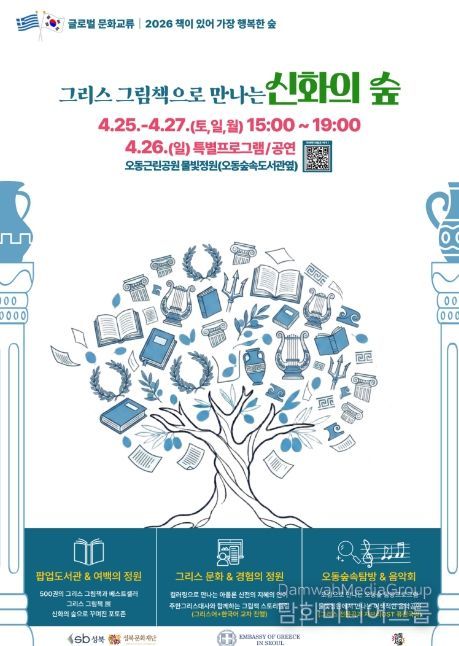 행사장 전역에는 ▲500여 권의 도서를 갖춘 ‘팝업도서관’ ▲숲속에서 감상하는 ‘그리스 그림책展’ ▲신화 속 장면을 재현한 ‘포토존’이 운영된다. 특히 고대 그리스 아폴론 신전의 델픽 격언을 배우는 ‘지혜의 언어 컬러링’과 ‘그리스 알파벳 스탬프 체험’은 어린이들이 고대 그리스 문화를 친숙하게 접할 수 있는 기회를 제공할 예정이다.