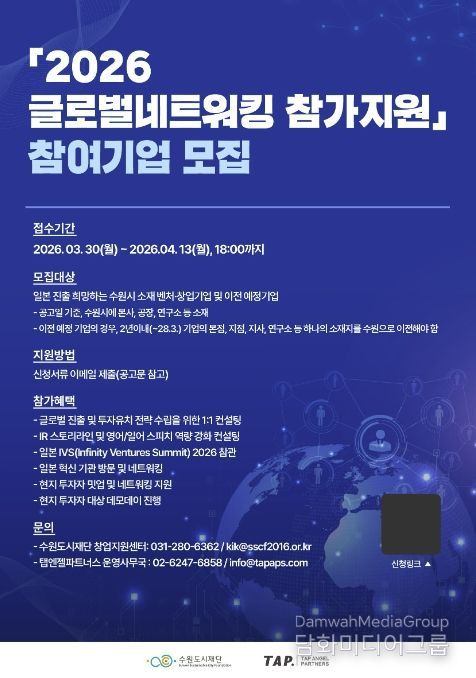 시민행정신문 강갑수 기자 | 수원특례시가 ‘2026 글로벌네트워킹 참가지원’에 참여할 벤처·창업 기업 7개사를 3월 30일부터 4월 13일까지 모집한다.