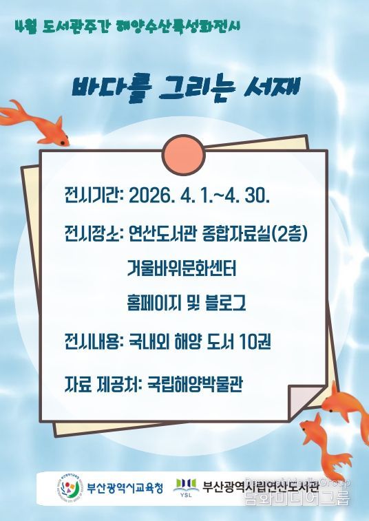 시민행정신문 기자 | 부산광역시립연산도서관은 2026년 도서관의 날 및 도서관주간을 맞아 오는 4월 1일부터 30일까지 도서관에서 지역주민과 이용자를 대상으로 해양수산 특성화 전시회 ‘바다를 그리는 서재’를 운영한다.