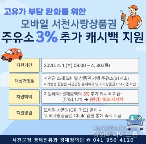 군은 오는 4월 1일부터 30일까지 한 달간 ‘모바일 서천사랑상품권 주유소 추가 캐시백 지원사업’을 한시적으로 추진한다고 밝혔다.