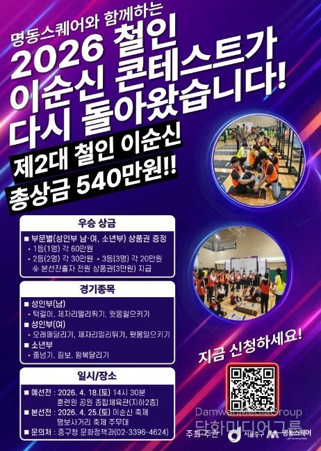시민행정신문 강갑수 기자 | 서울 중구가 지난해 큰 호응을 얻은 ‘철인 이순신’ 콘테스트를 올해도 열고,‘제2대 철인 이순신’을 선발한다. 오는 4월 18일 훈련원공원 종합 체육관에서 열리는 예선전을 거쳐, 25일 ‘2026 이순신 축제’에 마련되는 본선 경기로 최종 우승자를 가린다. 개인전 참가자는 4월 10일까지 온라인으로 신청할 수 있다.