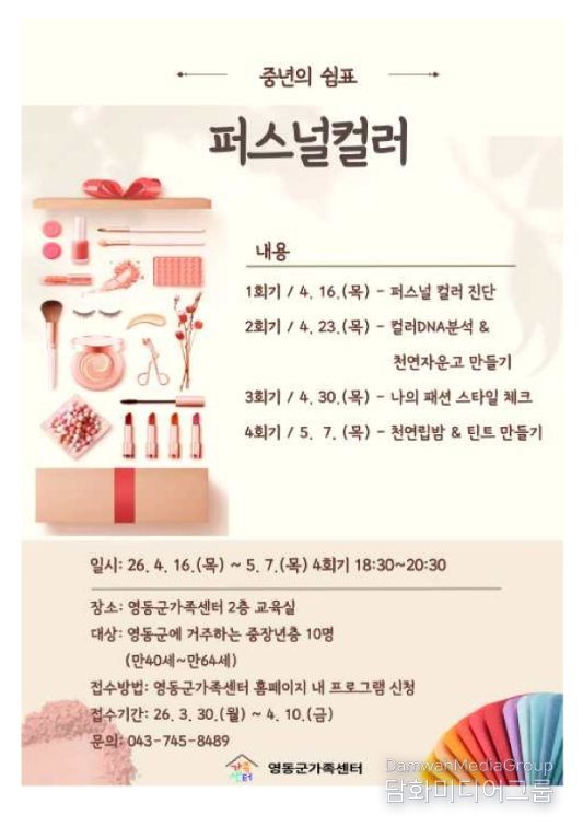 시민행정신문 강갑수 기자 | 충북 영동군가족센터가 중장년층의 자기 이해와 삶의 활력 증진을 위해 ‘중년의 쉼표–퍼스널컬러 프로그램’을 운영한다.