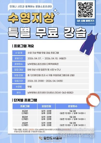 당진도시공사는 “이번 지상 무료 강습 프로그램을 통해 시민 들이 보다 안전하고 체계적으로 수영을 접할 수 있을 것으로 기대 한다”며 “앞으로도 시민 건강 증진과 생활 체육 활성화를 위한 공공서비스를 지속적으로 확대해 나가 겠다”고 밝혔다.