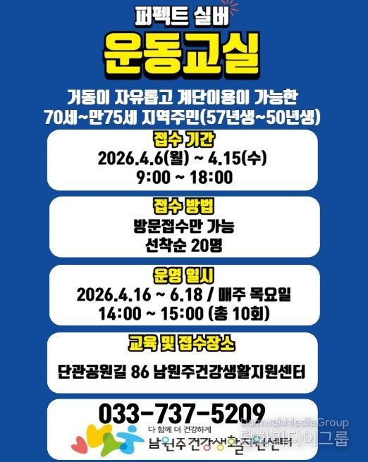 모집 대상은 자발적 거동이 가능하고, 계단 이동이 자유로운 70∼75세(1950∼1957년생) 지역 주민 선착순 20명 내외다. 4월 6일부터 15일까지 센터를 방문해 신청할 수 있다. 자세한 사항은 남원주건강생활지원센터로 문의하거나 센터 밴드를 확인하면 된다.