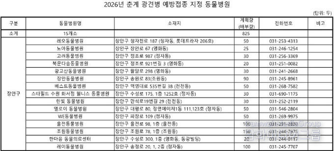 수원시 장안구 관계자는 “수원시에서 추진하는 광견병 예방접종 사업에 많은 시민들께서 참여하여 비용도 절감하고 시민과 반려동물의 안전을 지키길 바란다”면서, “자세한 사항은 각 구청 경제교통과(산업팀)으로 문의바란다”고 말했다.