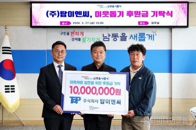 시민행정신문 강갑수 기자 | 인천시 남동구는 지난 27일 주식회사 탑이엔씨(대표 조은호)로부터 지역사회의 어려운 이웃을 돕기 위한 성금 1천만 원을 기탁받았다고 31일 밝혔다.