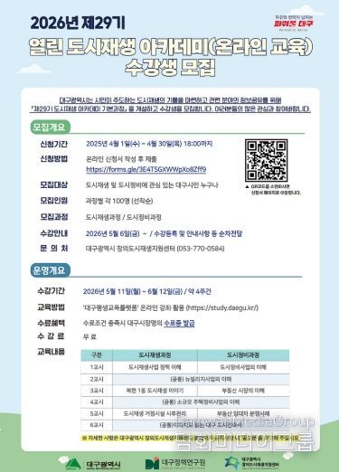 시민행정신문 강갑수 기자 | 대구광역시는 도시재생과 정비 사업에 대한 시민들의 올바른 이해와 역량 강화를 위해 ‘제29기 열린 도시재생 아카데미 기본과정(온라인교육)’ 수강생을 모집한다.