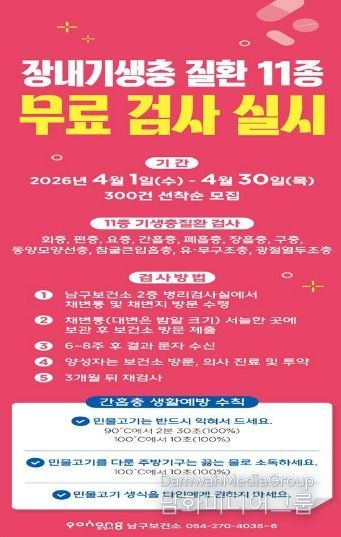 시민행정신문 기자 | 포항시 남·북구보건소는 지역 주민을 대상으로 장내 기생충질환 무료 검사를 실시한다. 남구보건소는 4월, 북구는 5월부터 시작하며, 보건소별로 300명을 선착순 모집한다.