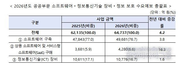 2026년 공공부문 소프트웨어·정보통신기술 장비 총 사업 금액은 6조 4,737억 원으로 전년 대비 4.2%(2,602억 원) 증가했으며, 총 사업 수 또한 16,274건으로 전년 대비 5.6% 증가했다. 사업 유형별로는 ①소프트웨어 구축 4조 9,681억 원(76.7%), ②소프트웨어 구매 4,280억 원(6.6%), ③정보통신기술 장비 1조 776억 원(16.7%)을 차지했다.