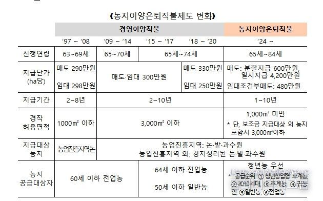 농식품부 강동윤 농촌소득에너지정책국장은 “이번 제도 개선은 고령 농업인의 현실적인 영농 여건을 반영한 것”이라며, “앞으로도 안정적인 노후소득 보장과 함께 원활한 영농 세대교체가 이루어질 수 있도록 제도를 지속적으로 보완해 나가겠다”고 밝혔다.