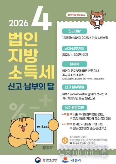 시민행정신문 강갑수 기자 | 강릉시는 ‘2026년 4월 법인지방소득세 신고·납부의 달’을 맞아 12월 결산법인의 2025년 귀속 법인소득에 대한 법인지방소득세를 오는 4월 30일까지 신고·납부해야 한다고 밝혔다.
