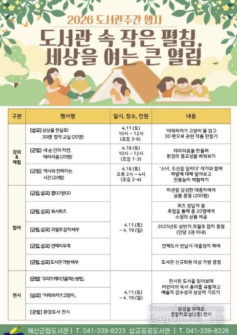 시민행정신문 강갑수 기자 | 예산군 공공도서관은 제62회 도서관주간을 맞아 오는 4월 11일부터 19일까지 예산군립도서관과 삽교공공도서관에서 ‘도서관 속 작은 펼침, 세상을 여는 큰 열림’을 주제로 다양한 독서문화 프로그램을 운영한다.