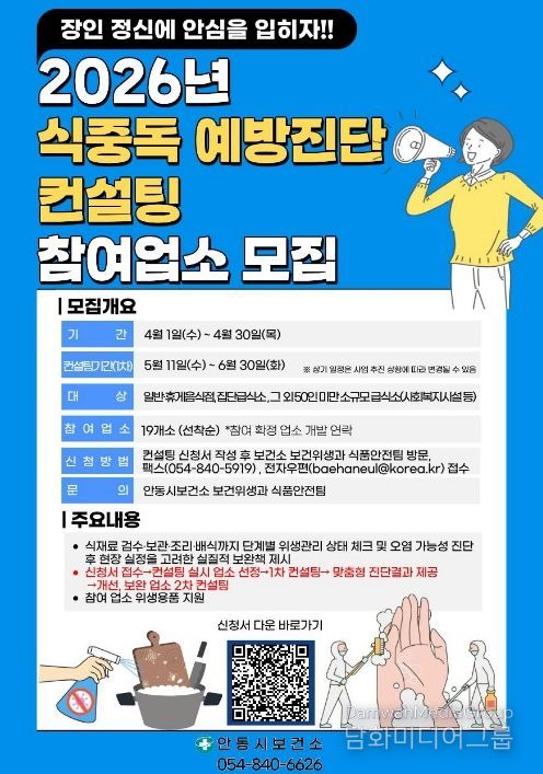 시민행정신문 기자 | 안동시는 식중독 발생 우려가 높은 업소를 대상으로 위생 수준 향상과 사전 예방을 위해‘2026년 식중독 예방진단 컨설팅’ 참여업소를 모집한다고 밝혔다.