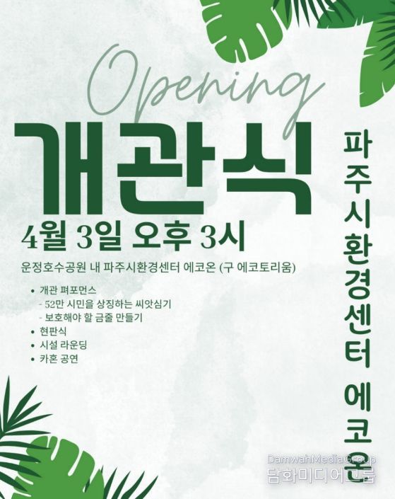 시민행정신문 강갑수 기자 | 파주시는 오는 4월 3일 운정호수공원 내 에코토리움에서 '파주시환경센터 에코온' 개관식을 열 예정이다.
