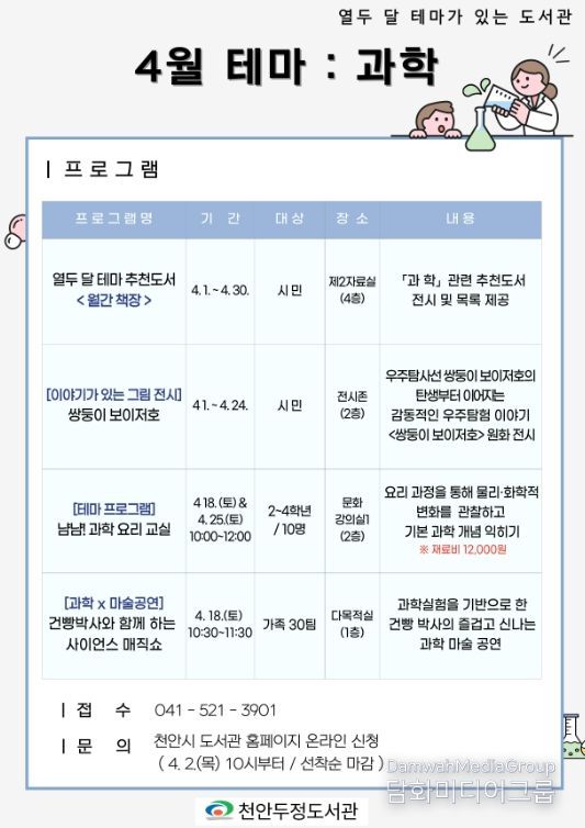 시민행정신문 강갑수 기자 | 천안시 두정도서관은 4월 한 달간 ‘과학’을 주제로 도서관을 운영한다고 1일 밝혔다.
