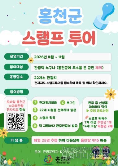 시민행정신문 기자 | 홍천군이 봄철 관광객 맏이에 나선다. 홍천군은 4월부터 11월까지 관광객을 대상으로 ‘2026 홍천군 도장 찍기 여행(스탬프 투어)’를 운영한다고 밝혔다.
