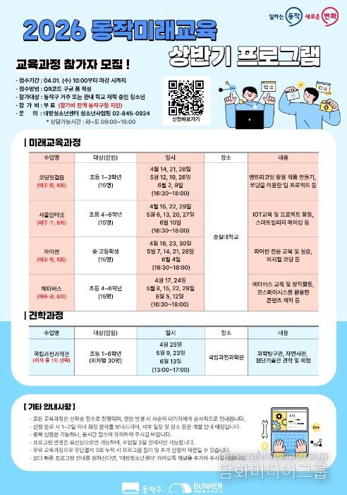박일하 동작구청장은 “미래 사회를 이끌어갈 아동·청소년들이 디지털 기술과 창의적 사고 역량을 자연스럽게 키울 수 있도록 이번 교육과정을 마련했다”며, “앞으로도 아이들이 다양한 미래교육을 경험하며 진로를 탐색할 수 있도록 적극 지원하겠다”고 말했다.