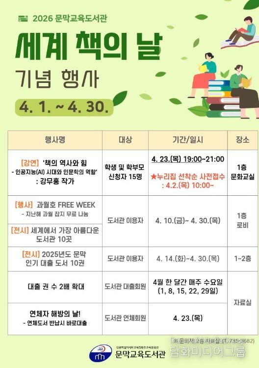 시민행정신문 강갑수 기자 | 문막교육도서관은 2026년 ‘세계 책의 날’을 기념하여 4월 한 달간 학생, 학부모 및 지역 주민을 대상으로 다양한 독서문화 행사를 운영한다.