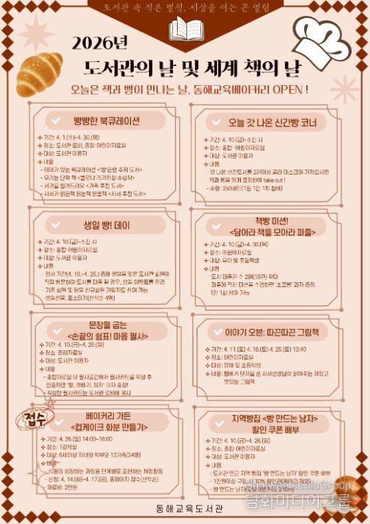 시민행정신문 강갑수 기자 | 동해교육도서관은 4월 12일 도서관의 날과 4월 23일 세계 책의 날을 맞아 ‘오늘은 책과 빵이 만나는 날, 동해교육베이커리 오픈(OPEN)!’을 주제로 지역주민과 함께하는 독서문화 행사를 운영한다.