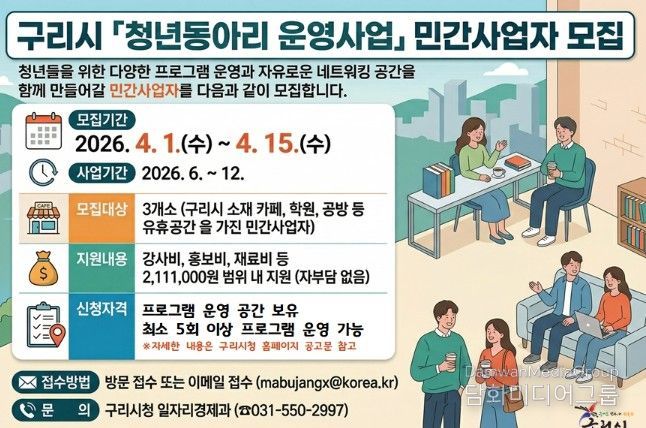 시민행정신문 이세훈 기자 | 구리시는 4월 1일부터 청년들의 자율적이고 창의적인 활동을 지원하기 위한 ‘구리시 청년동아리’를 운영할 민간사업자를 모집한다고 밝혔다.