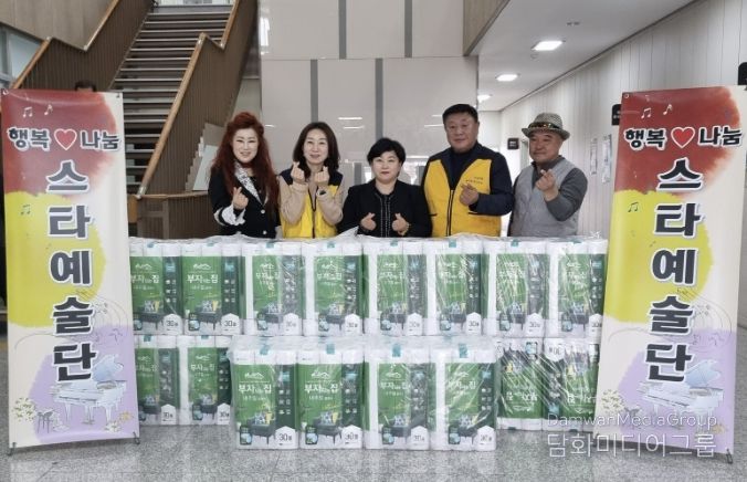 시민행정신문 강갑수 기자 | 행복나눔 문화예술봉사회와 스타예술단이 지난 1일 온양6동 행복키움추진단에 휴지 40세트를 전달하며 나눔을 실천했다. ㈜이수에코테크와 조양산업도 뜻을 함께했다.