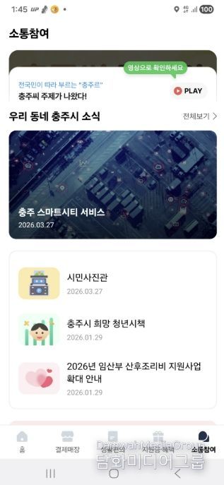 시민행정신문 강갑수 기자 | 충주시는 시민들이 일상에서 보다 편리하게 도시 정보를 이용할 수 있도록 ‘충주사랑상품권’ 앱 내 소통참여 서비스를 통해 스마트시티 통합플랫폼 모바일 홈페이지를 연계했다고 2일 밝혔다.