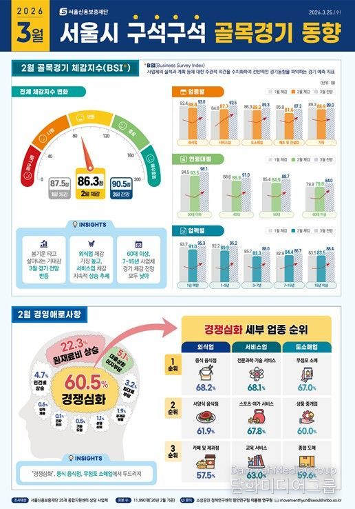 시민행정신문 이세훈 기자 | 서울신용보증재단이 매월 발간하는'서울시 구석구석 골목경기 동향'이 월별 골목경기 동향에 더해 업종별 매출·소득과 경영애로, 자금 활용까지 분석 범위를 확대했다. 소상공인 체감경기를 다양한 항목으로 진단해 현장 활용도를 높인 것이 특징이다.