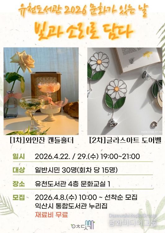 익산시는 오는 22일과 29일 유천도서관에서 '빛과 소리로 담다'를 주제로 '와인잔 캔들홀더 만들기'와 '글라스아트 도어벨 만들기' 체험을 운영한다고 2일 밝혔다.