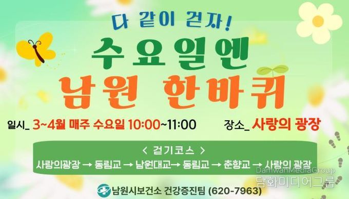 시민행정신문 강갑수 기자 | 남원시보건소가 시민의 건강 증진과 일상 속 운동 습관 형성을 위해 오는 4월부터 11월까지 걷기 실천 프로그램인 ‘수요일엔 남원 한바퀴’를 운영한다.