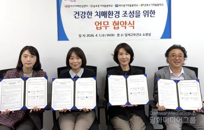 시민행정신문 강갑수 기자 | 대구 달서구는 지난 1일 늘푸른기억돌봄학교, 대구샘기억돌봄학교, 상록수기억돌봄학교와 업무협약을 체결하고, 인지저하 및 경증치매 어르신을 위한 통합돌봄 체계 구축에 나선다.