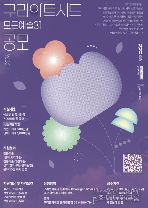 시민행정신문 강갑수 기자 | (재)구리문화재단은 구리 시민의 문화 향유 기회를 확대하고 지역 예술 생태계를 활성화하기 위한 2026년 예술인지원 사업 ‘구리아트시드(모든 예술 31)’ 공모를 오는 4월 10일 오후 6시까지 접수한다고 밝혔다.