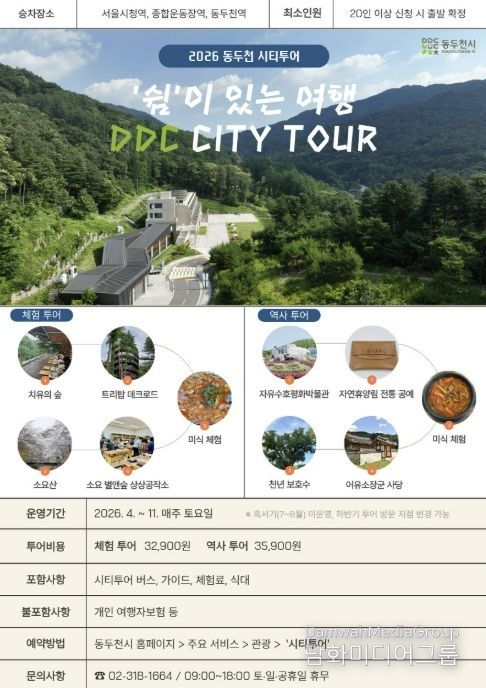 시민행정신문 강갑수 기자 | 동두천시는 벚꽃 명소와 자연 힐링, 공예 체험을 함께 즐길 수 있는 ‘2026 동두천 시티투어(DDC City tour)’를 오는 4월부터 혹서기를 제외하고 매주 토요일 운영한다고 밝혔다.