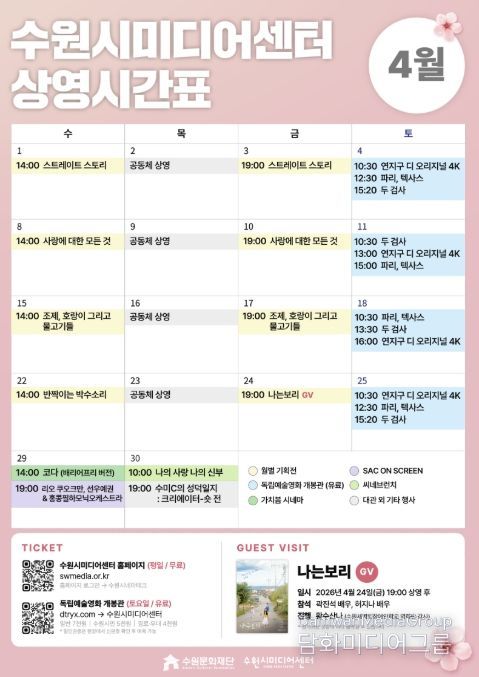 수원시미디어센터 관계자는 “이번 업무협약을 통해 누구나 차별 없이 문화를 접하고 누릴 수 있는 환경을 조성하고자 한다”며, “4월 장애인의 날을 맞아 운영하는 기념 프로그램을 시작으로, 배리어프리 영화 상영을 지속 확대해 나가겠다”고 밝혔다.