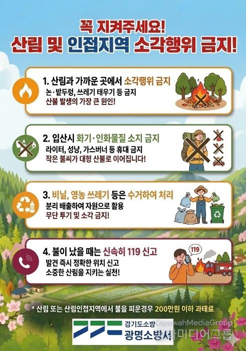 이에 따라 광명소방서는 봄철 기간 동안 산림 인접지역과 주거 밀집지역, 화재취약시설을 중심으로 예방순찰과 안전지도를 강화하고, 시민 대상 화재예방 홍보를 집중 추진할 방침이다. 특히 산림 및 인접지역 소각행위 금지, 담배꽁초 무단 투기 금지, 쓰레기 소각 금지 등 부주의 화재예방 수칙을 적극 안내할 예정이다.