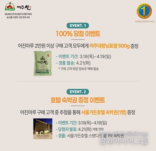 이번 이벤트는 ‘대왕님표 여주쌀’의 한국산업의 브랜드파워(K-BPI) 농산업 부문 1위 2년 연속 선정 성과를 기념해 마련됐다. 한편, 지난 3월 19일부터 3월 31일까지 진행된 ‘여주대왕님표’ 초성퀴즈 이벤트에는 총 7,883명이 참여하며 높은 관심 속에 성황리에 마무리됐다.
