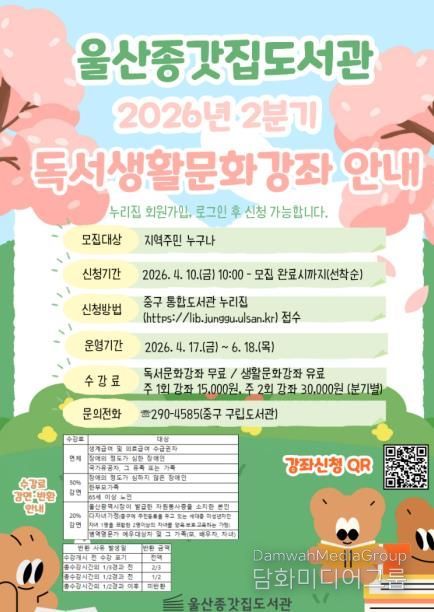 시민행정신문 강갑수 기자 | 울산 중구에서 운영하는 울산종갓집도서관이 2026년 2분기 독서·생활문화강좌 수강생을 모집한다.