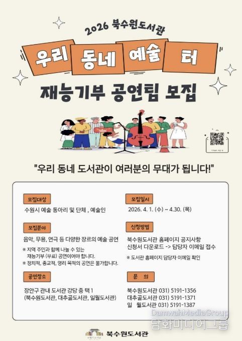수원시 관계자는 “이번 사업은 이웃의 재능을 나누며 도서관을 소통의 공간으로 만드는 데 의미가 있다”며 “지역 예술인에게는 무대를, 시민에게는 문화 향유 기회를 제공하는 만큼 많은 참여를 바란다”고 말했다.