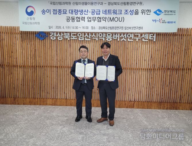 시민행정신문 이세훈 기자 | 경상북도산림환경연구원은 임산식약용버섯연구센터에서 1일 산림청 국립산림과학원과 ‘송이 접종묘 대량생산·공급 네트워크 조성’을 위한 업무협약(MoU)을 체결했다.