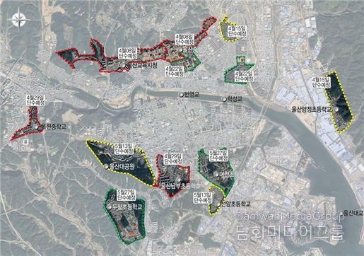 이 기간 동안 ▲중구 유곡동, 우정동, 교동, 복산동, 성안동, 태화동, 남외동, 서동, 북정동, 반구동, 약사동 일부 지역 ▲남구 옥동, 신정2동, 신정4동, 선암동, 야음동, 무거동, 두왕동 일부 지역 ▲북구 양정동 일부 지역에서 순차적으로 단수가 진행된다.