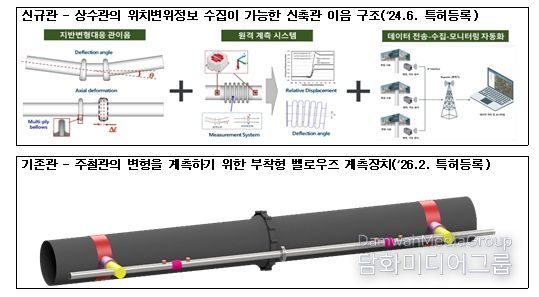 새로운 관로를 매설하면서 신축관을 활용해 센서를 부착하는 ‘상수관의 위치변위정보 수집이 가능한 신축관 이음 구조’와 기존 매설돼 있는 관로 중 일부 침하가 예측되는 구간만 집중 관리할 수 있도록 고안한 ‘주철관의 변형을 계측하기 위한 부착형 벨로우즈 계측장치’ 2가지이다.