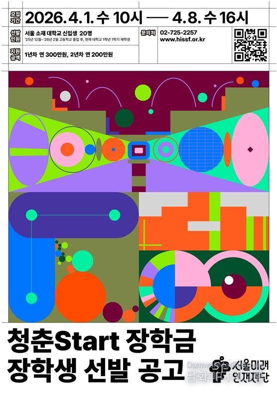 시민행정신문 강갑수 기자 | 서울미래인재재단이 ㈜두산 임직원 기부금으로 14년째 운영 중인 '청춘Start장학금' 14기 장학생 20명을 모집한다. 서울 소재 대학에 올해 입학한 저소득 신입생을 대상으로 2년간 총 500만 원의 학업장려금을 지급하며, 신청은 4월 8일 16시까지 재단 누리집에서 받는다.
