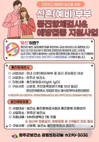 시민행정신문 강갑수 기자 | 완주군이 신혼부부의 건강한 임신과 행복한 가정을 돕고자 관내 예비·신혼부부 여성을 대상으로 풍진 항체 검사와 예방접종 지원 활동을 펼치며 건강한 출산 환경을 조성하고 있다.